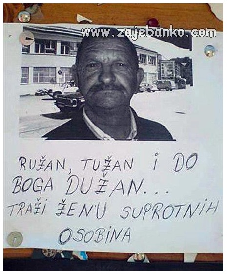 Ružan, tužan i do Boga dužan, traži žensku osobu suprotnih osobina.